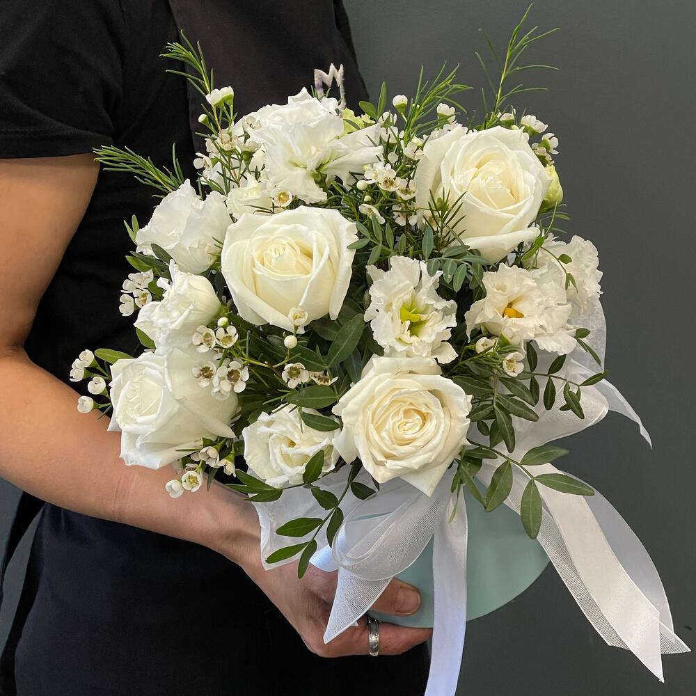 “Атлас☁️” – цветочная композиция с зефиром в деревянном ящике