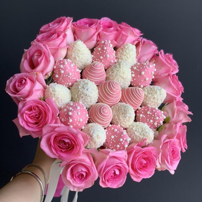 Клубника в шоколаде – 19 шт.Роза розовая – 19 шт.бумага упаковочная – 1 шт.Лента атласная – 1 шт.Открытка – 1 шт.