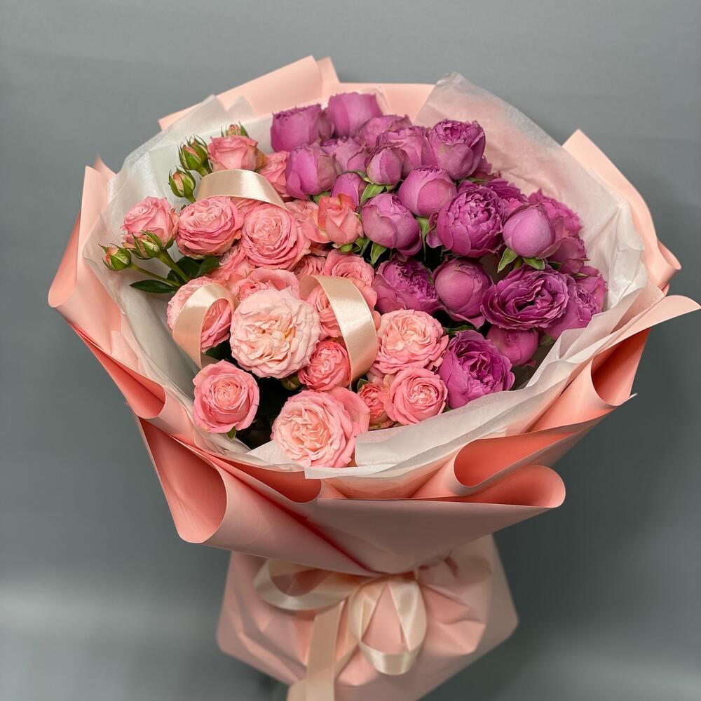 Лента – 2 шт.Роза кустовая пионовидная – 9 шт.Оформление матовая пленка – 7 шт.аквапак с водой – 1 шт.оформление тишью – 4 шт.