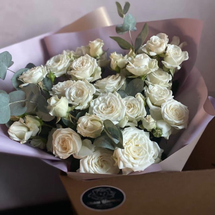 Кустовая роза – 7 шт.Эвкалипт – 3 шт.декоративная упаковка – 1 шт.Атласная лента – 1 шт.