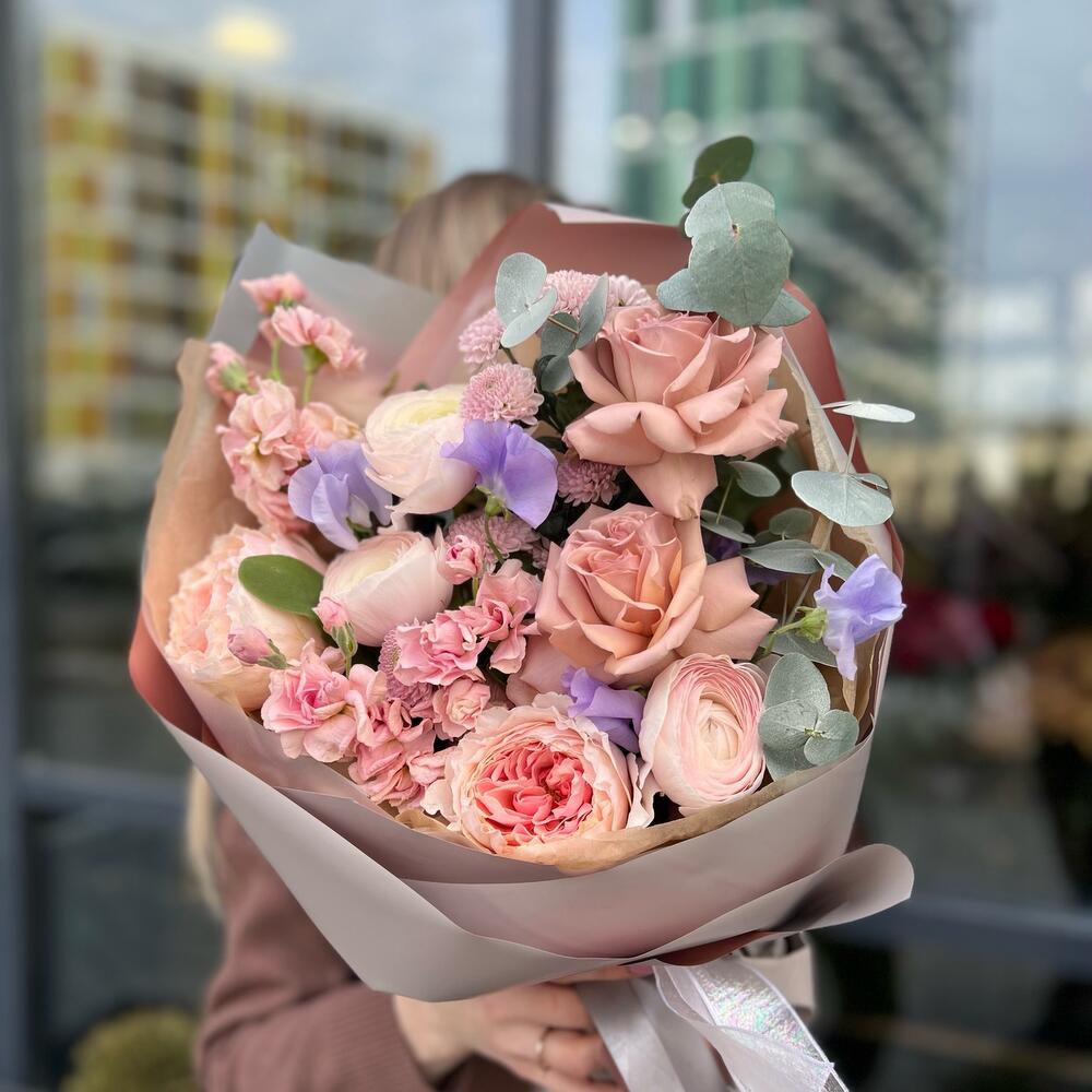 Душистый горошек – 4 шт.Ранункулюс – 3 шт.Пионовидная роза – 2 шт.Одноголовая роза – 2 шт.Маттиола – 3 шт.Сантини – 3 шт.Эвкалипт – 4 шт.декоративная упаковка – 1 шт.Атласная лента – 1 шт.