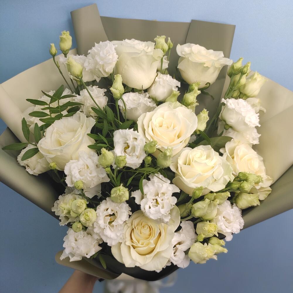 Роза – 9 шт.Эустома – 7 шт.Фисташка – 1 шт.