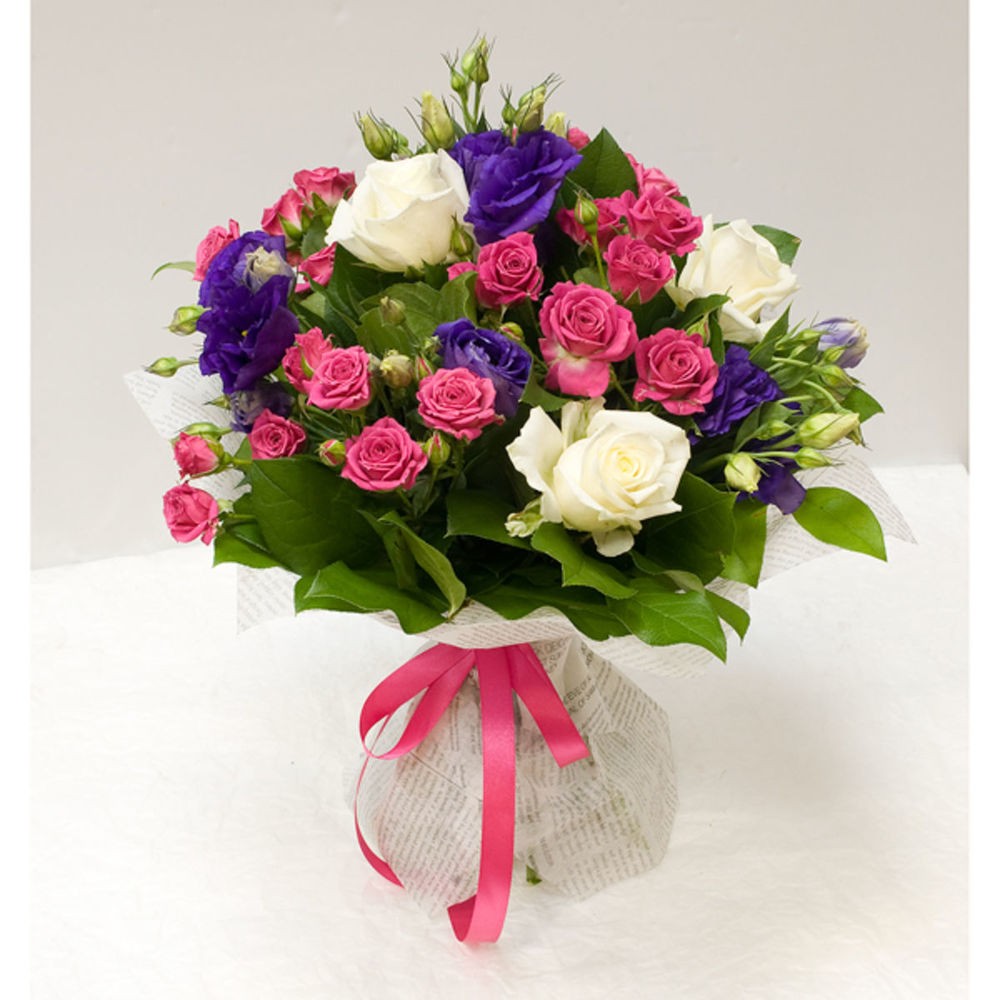 Роза – 3 шт.Роза кустовая – 3 шт.Лизиантус – 4 шт.Салал – 1 шт.Фетр – 1 шт.Лента – 1 шт.