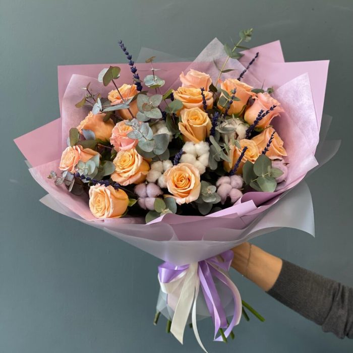 Лаванда (сухоцвет) – 15 шт.Лента – 2 шт.Хлопок – 7 шт.Эвкалипт – 4 шт.Роза одноголовая – 15 шт.Упаковка дизайнерская – 2 шт.Кризал (подкормка) – 1 шт.