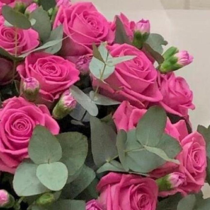 Роза розовая – 19 шт.Эвкалипт – 10 шт.Упаковка дизайнерская – 1 шт.Лента атласная – 2 шт.Открыточка с вашими пожеланиями – 1 шт.хорошее настроение – 100 шт.инструкция по уходу за цветами – 1 шт.коробка переноска – 1 шт.Кризал – 1 шт.