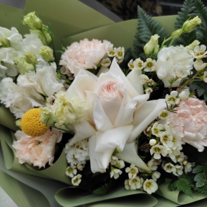 Роза – 1 шт.Лизиантус – 2 шт.Ваксфлауэр – 2 шт.Маттиола – 1 шт.Диантус – 3 шт.Папоротник – 2 шт.Лента – 2 шт.Упаковка дизайнерская – 2 шт.