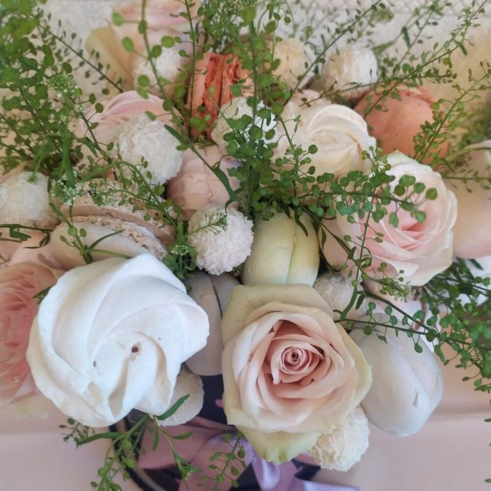 “Атлас☁️” – цветочная композиция с зефиром в деревянном ящике