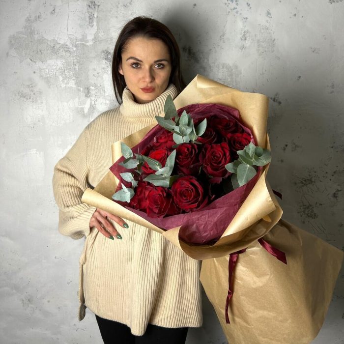 роза эваадор 60 см – 15 шт.Эвкалипт – 5 шт.Упаковка дизайнерская – 3 шт.Лента атласная – 1 шт.