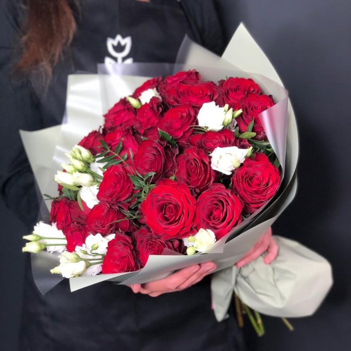 Роза – 25 шт.Эустома – 4 шт.Фисташка пучок – 5 шт.Крафт упаковка – 5 шт.
