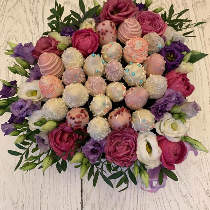 “Сладкое сердце ” – цветочная композиция с сладостями в коробке “Сердце”
