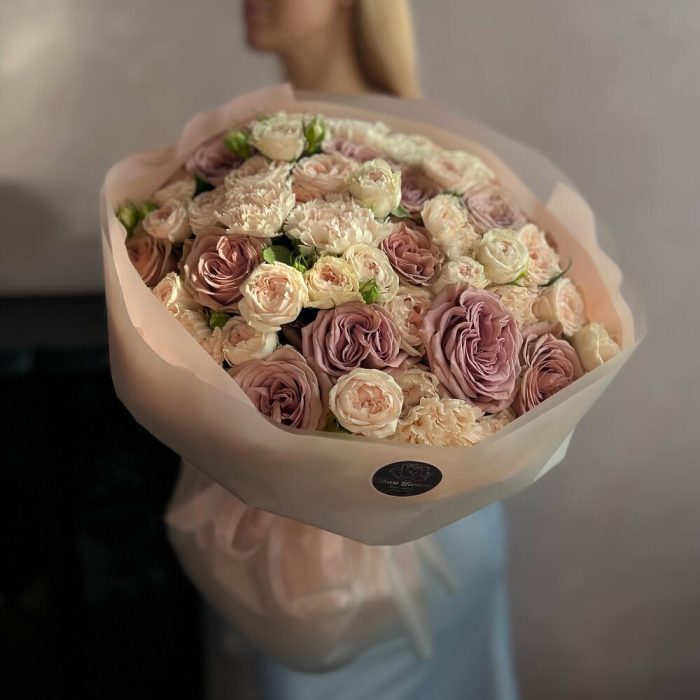 Пионовидная роза – 12 шт.Кустовая роза – 7 шт.Диантус – 9 шт.декоративная упаковка – 1 шт.Атласная лента – 1 шт.