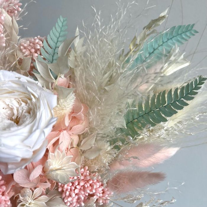 Лента органза – 1 шт.Лента шелк – 1 шт.Роза стабилизированная – 1 шт.гортензия стабилизированная – 1 шт.Лагурус – 14 шт.Нигелла – 1 шт.Озотамнус – 1 шт.пампасная трава – 1 шт.папоротник стабилизированный – 4 шт.Фаларис – 10 шт.Ковыль – 2 шт.Рускус – 3 шт.
