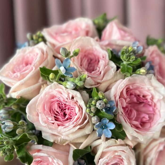 Пионовидная роза – 11 шт.Атласная лента – 1 шт.Оксипеталум – 9 шт.