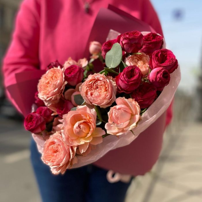 Букет пионовидных роз с эвкалиптом