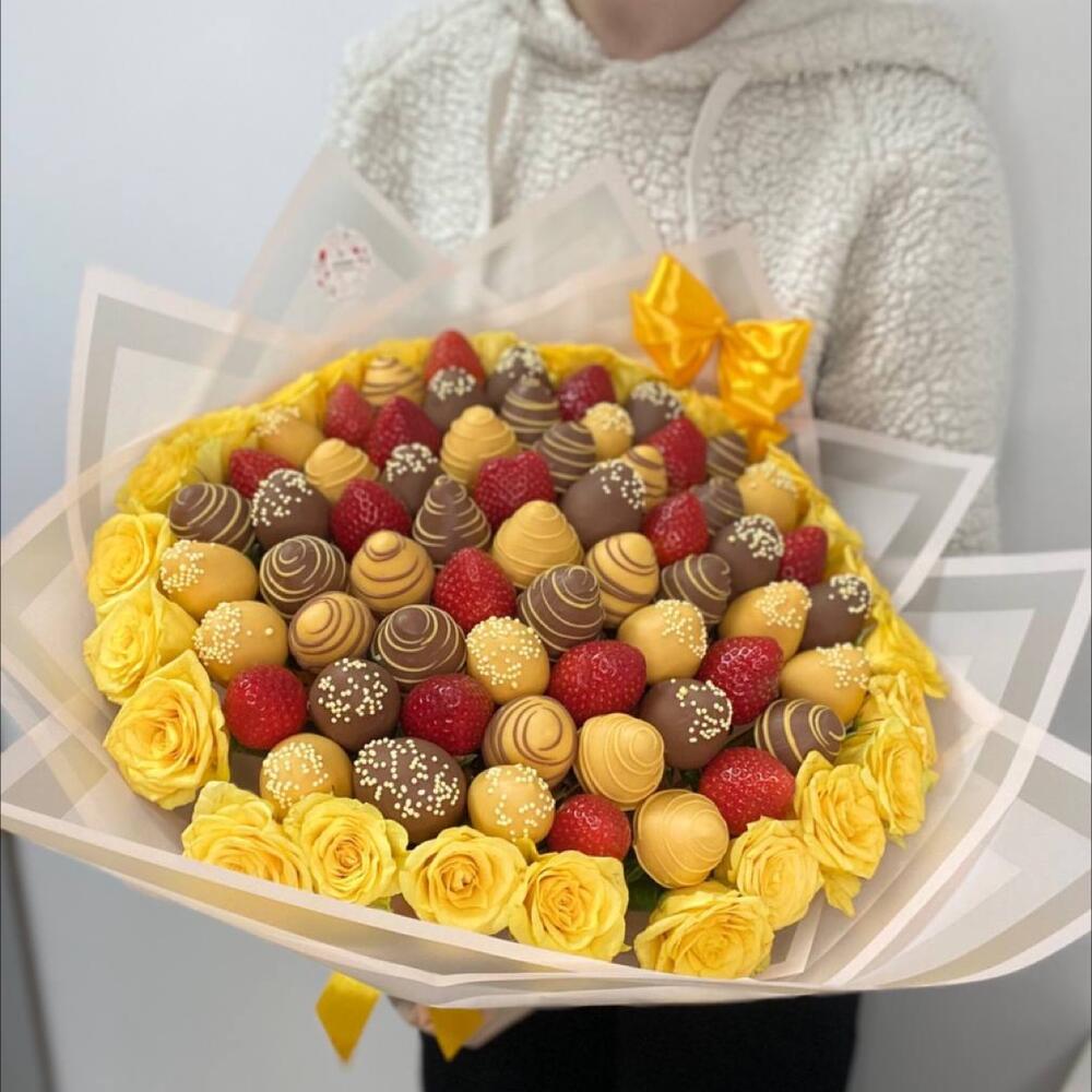 свежая клубника – 2000 гр.Бельгийский шоколад – 400 гр.кондитерская посыпка – 15 гр.Желтая роза – 25 шт.Упаковка дизайнерская – 1 шт.Лента атласная – 1 шт.