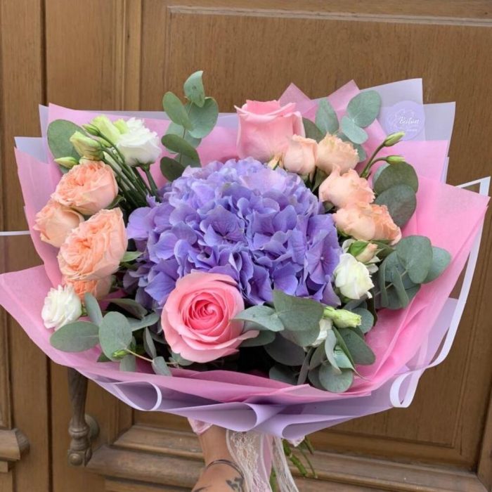 Гортензия сиреневая – 1 шт.Роза розовая – 2 шт.Роза кустовая – 2 шт.Лизиантус – 1 шт.Эвкалипт – 1 шт.Дизайнерская упаковка – 1 шт.октрыточка с вашими пожеланиями – 1 шт.Шоколадка – 1 шт.