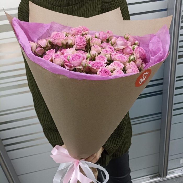 Лента атласная – 2 шт.Роза кустовая розовая – 15 шт.Крафт упаковка – 3 шт.
