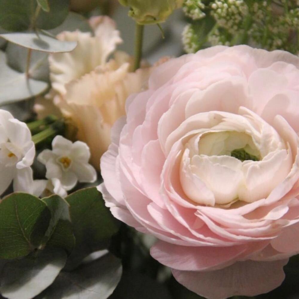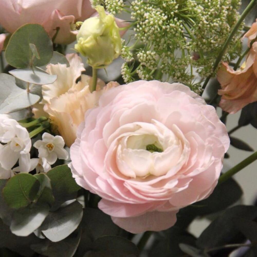 Ранункулюс (лютик) – 1 шт.Роза сортовая – 2 шт.Нарцисс кустовой – 2 шт.Маттиола – 1 шт.Львиный зев – 1 шт.Зонтик – 3 шт.Лизиантус – 2 шт.Эвкалипт – 3 шт.Ветви – 2 шт.Лента – 1 шт.