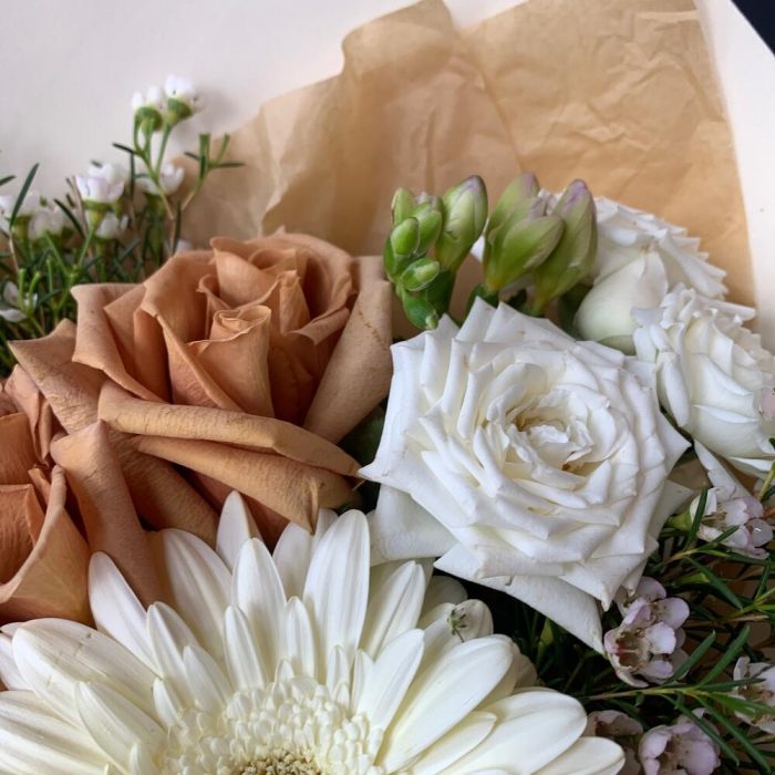 Гербера – 1 шт.Роза пионовидная – 3 шт.Лизиантус – 1 шт.Кустовая роза – 2 шт.Фрезия – 2 шт.Хамелациум – 2 шт.декоративная упаковка – 1 шт.Атласная лента – 1 шт.