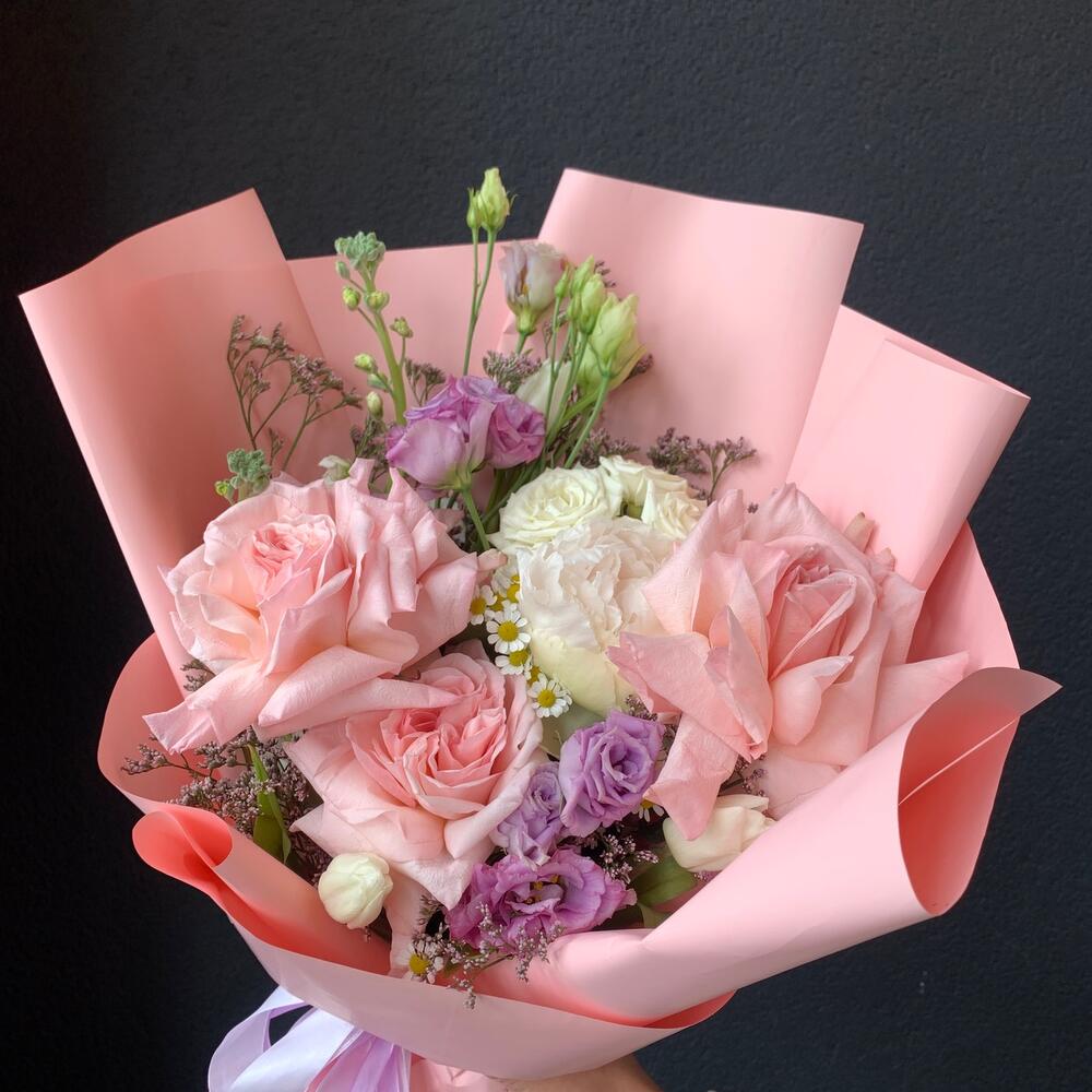Лизиантус – 2 шт.Лимониум – 2 шт.Маттиола – 2 шт.Пион – 1 шт.Тюльпан – 3 шт.Кустовая роза – 1 шт.Пионовидная роза – 3 шт.декоративная упаковка – 1 шт.Атласная лента – 1 шт.
