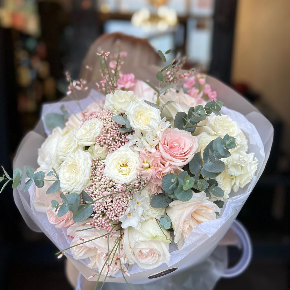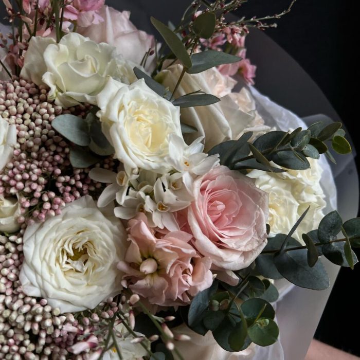 Пионовидная роза – 7 шт.Кустовая роза – 5 шт.Одноголовая роза – 3 шт.Гениста – 2 шт.Озотамнус – 2 шт.Маттиола – 3 шт.нарциссов – 5 шт.Эвкалипт – 5 шт.декоративная упаковка – 1 шт.Атласная лента – 1 шт.