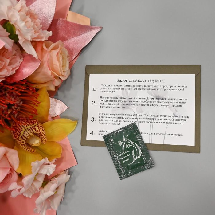 - Сроки возврата: Претензии по качеству букета принимаются в течение 24 часов с момента его получения.
