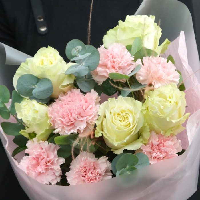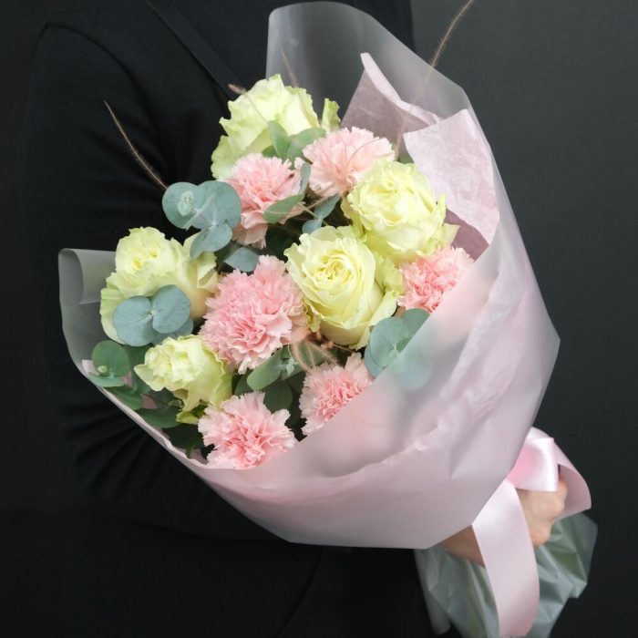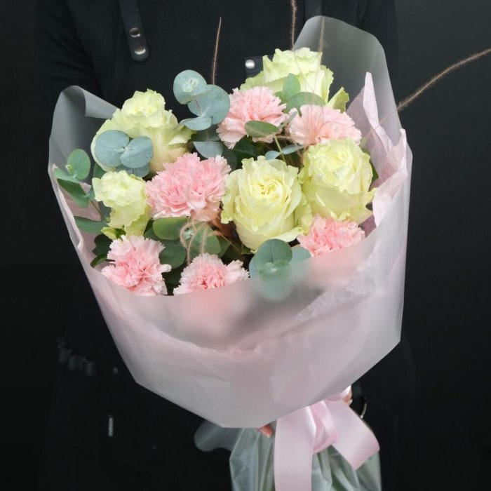 Эвкалипт – 1 шт.Роза – 5 шт.Упаковка – 1 шт.Диантус – 6 шт.Стифа – 2 шт.Инструкция по уходу – 1 шт.подкормка для срезанных цветов – 1 шт.