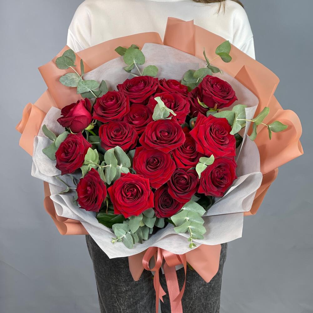 Лента – 2 шт.Эвкалипт – 2 шт.Упаковка – 2 шт.Роза наоми – 19 шт.