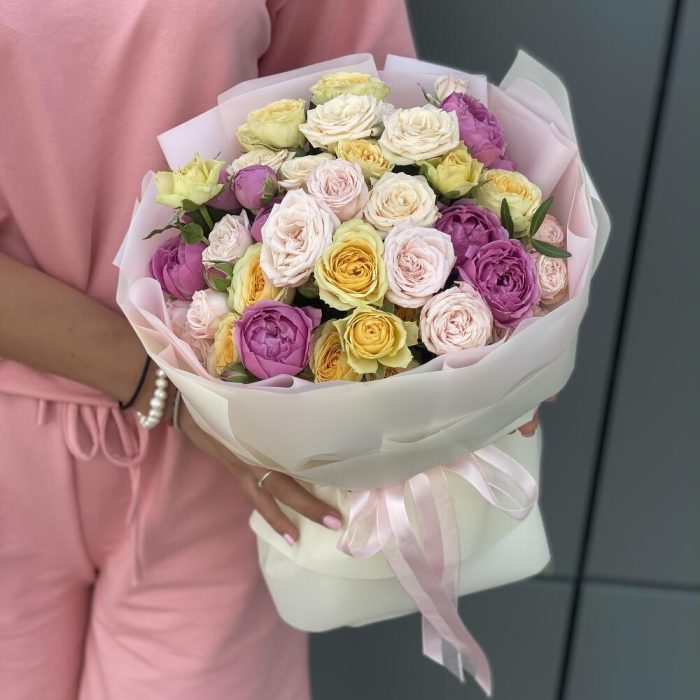 Букет Юбилейный из кустовых пионовидных роз и хризантемы