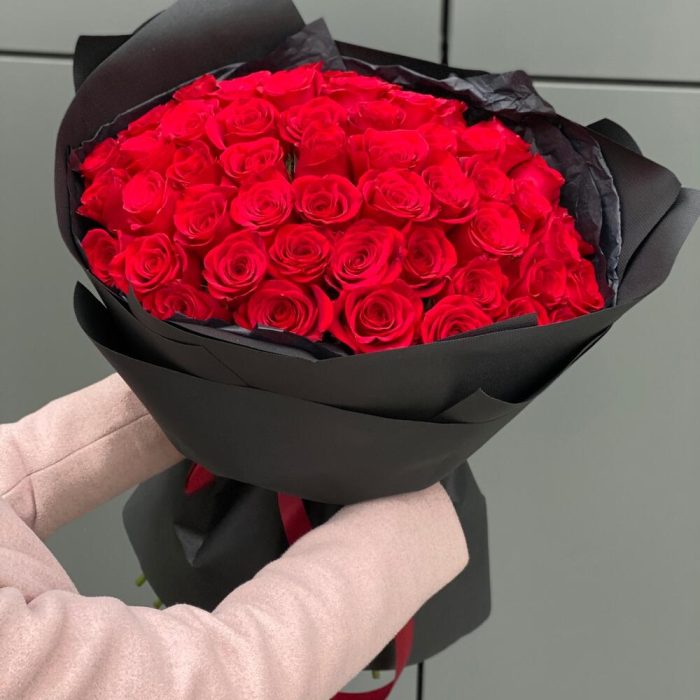 Букет из 51 красной розы в черном стильном оформлении!