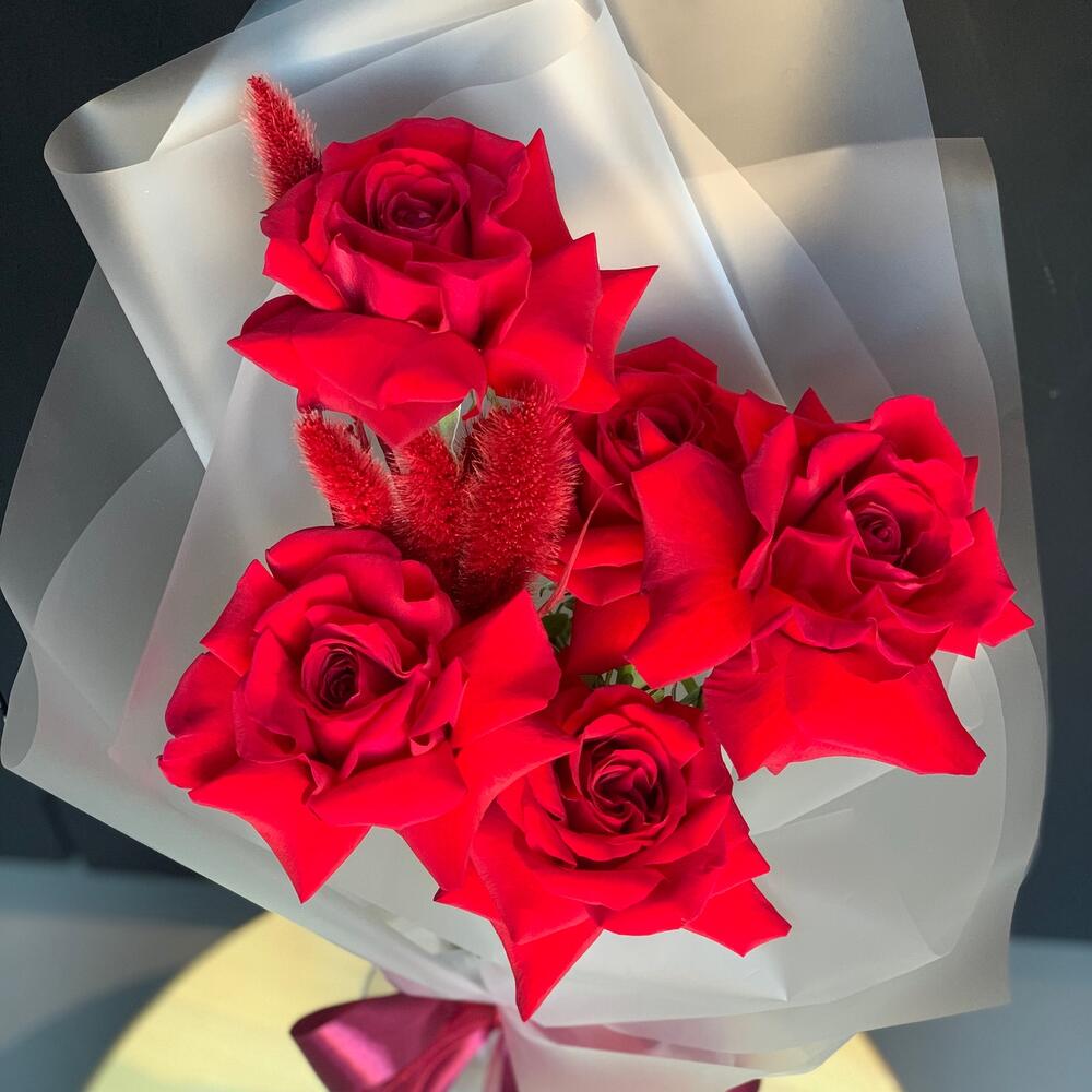 Лента атласная – 1 шт.Фисташка – 3 шт.Упаковка дизайнерская – 1 шт.Сетария – 5 шт.роза красная50 см – 5 шт.