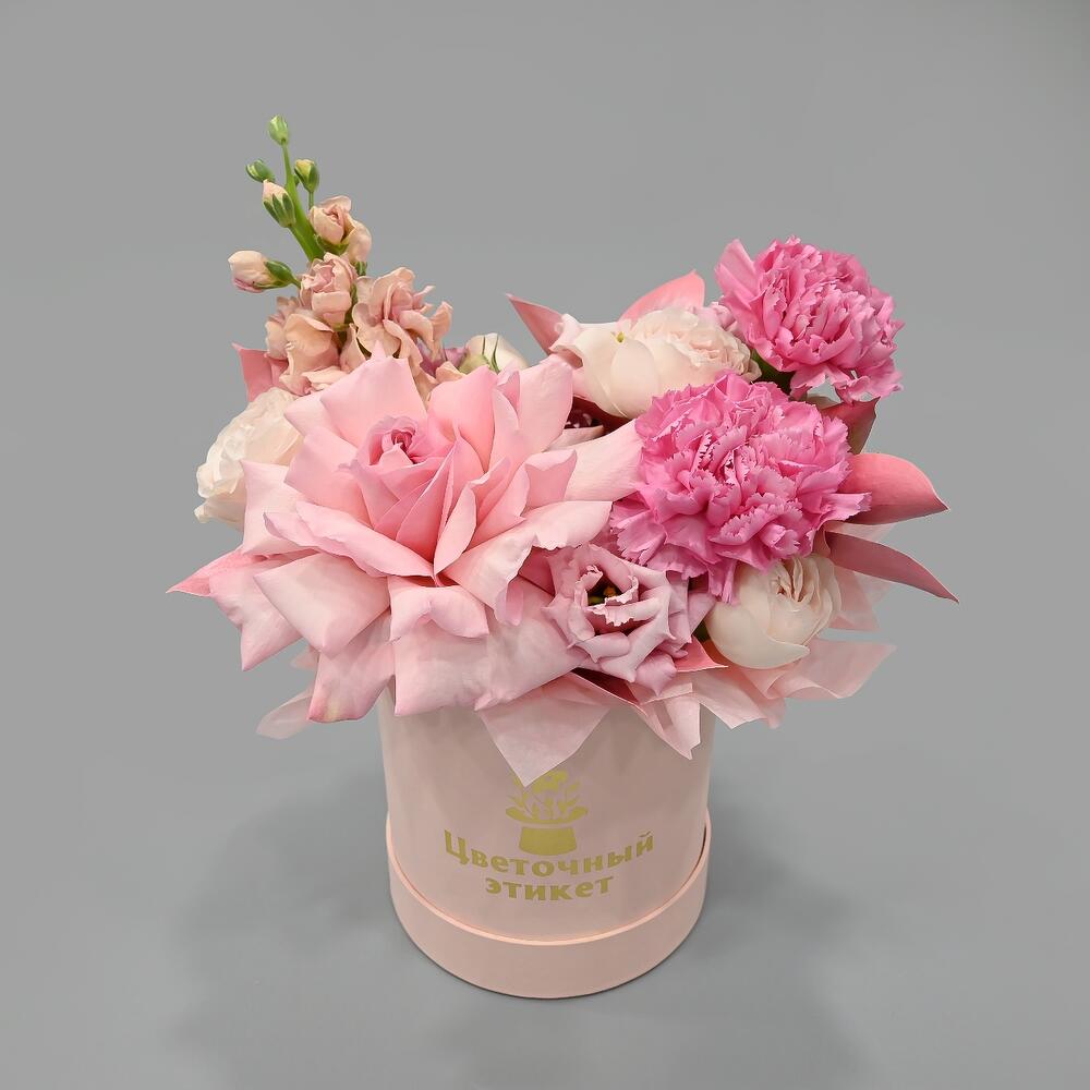 Маттиола – 1 шт.Рускус – 3 шт.Гвоздика – 2 шт.Эустома – 1 шт.Шляпная коробка – 1 шт.Французская роза – 1 шт.Пионовидная кустовая роза – 1 шт.Оазис флористический – 1 шт.