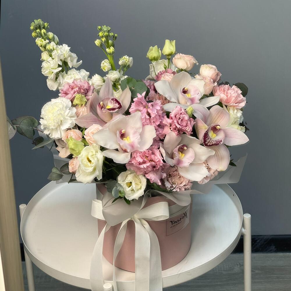 Орхидея Цимбидиум – 5 шт.Эустома – 2 шт.Кустовая роза – 2 шт.Диантус – 3 шт.Маттиола – 2 шт.Эвкалипт – 6 шт.Фисташка – 2 шт.Шляпная коробка – 1 шт.Оазис – 1 шт.