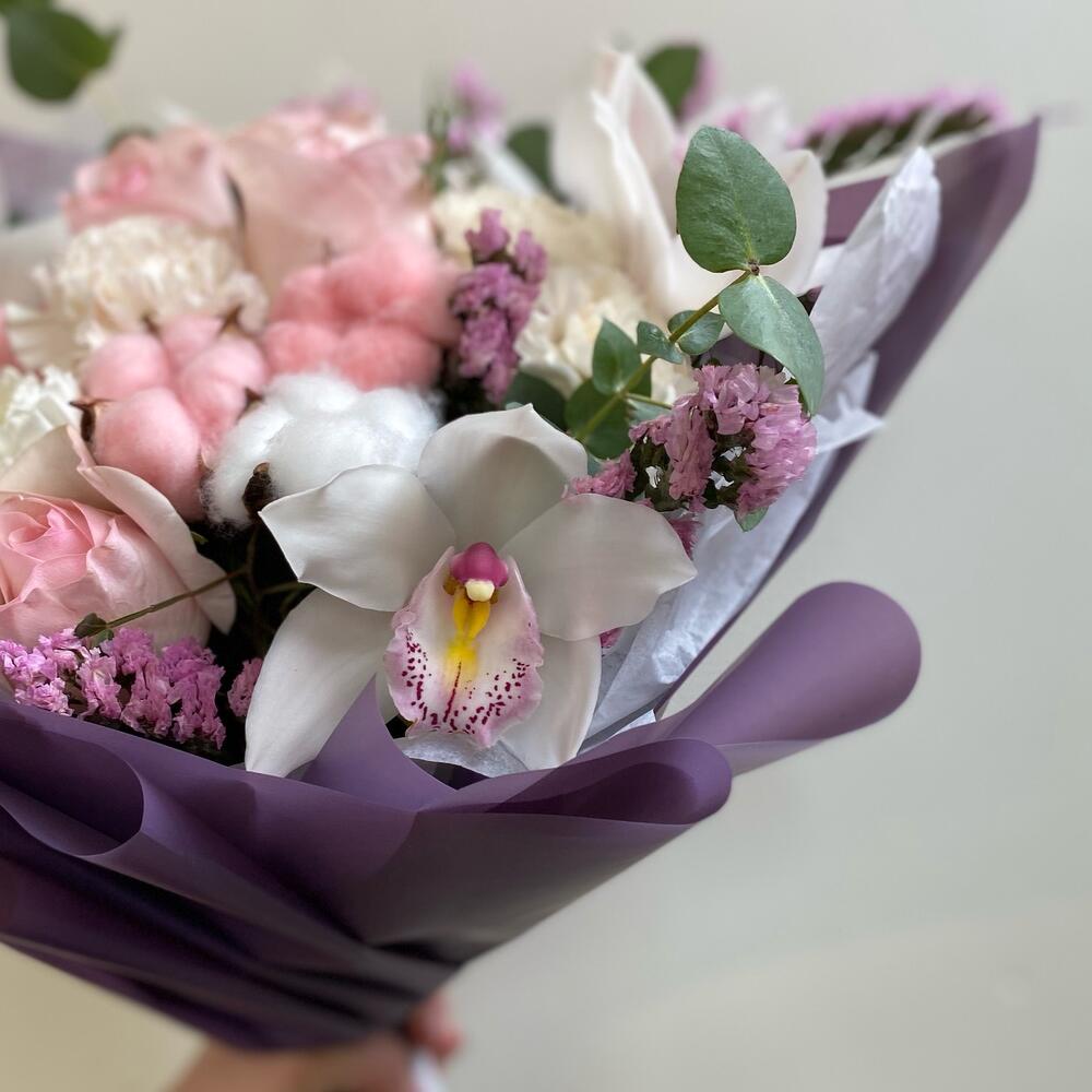 Орхидея Цимбидиум – 5 шт.Статица – 6 шт.Эвкалипт – 4 шт.Роза Эквадор – 5 шт.Лента атласная – 5 шт.Фисташка – 5 шт.Упаковка дизайнерская – 9 шт.Хлопок натуральный – 4 шт.Диантус сортовой – 5 шт.