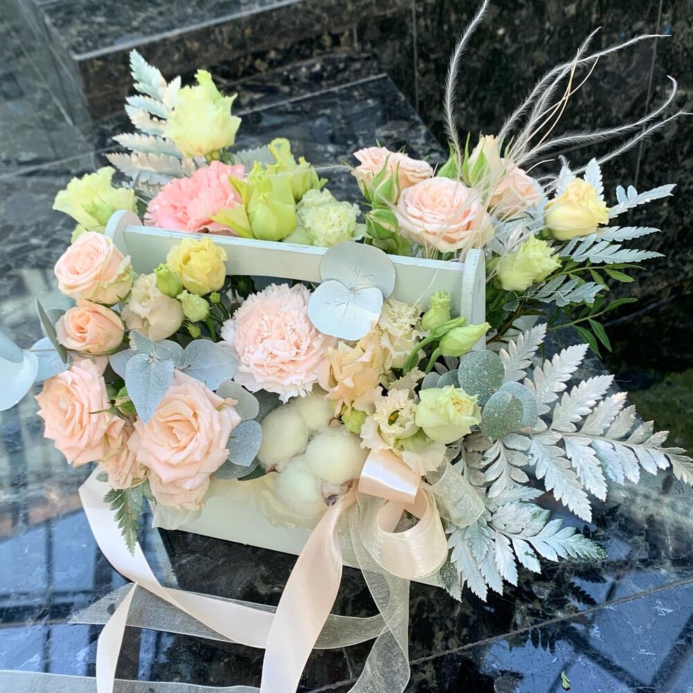 “Атлас☁️” – цветочная композиция с зефиром в деревянном ящике