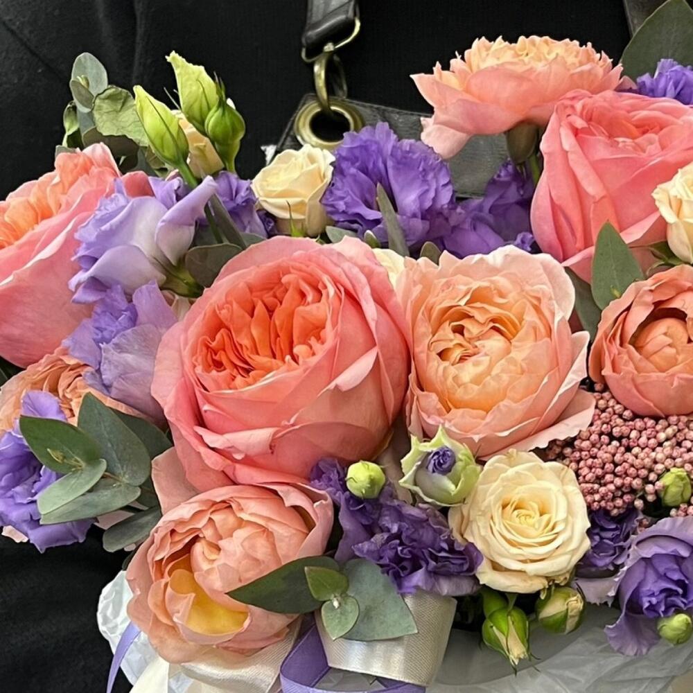 роза пионовидная пинк экспрешн – 3 шт.роза кустовая таня – 1 шт.роза пионовидная кустовая джульетта – 1 шт.эустома лавандовая – 3 шт.Озотамнус – 1 шт.Эвкалипт – 3 шт.Тишью – 1 шт.Оазис флористический – 1 шт.Коробка шляпная – 1 шт.Лента атласная – 2 шт.