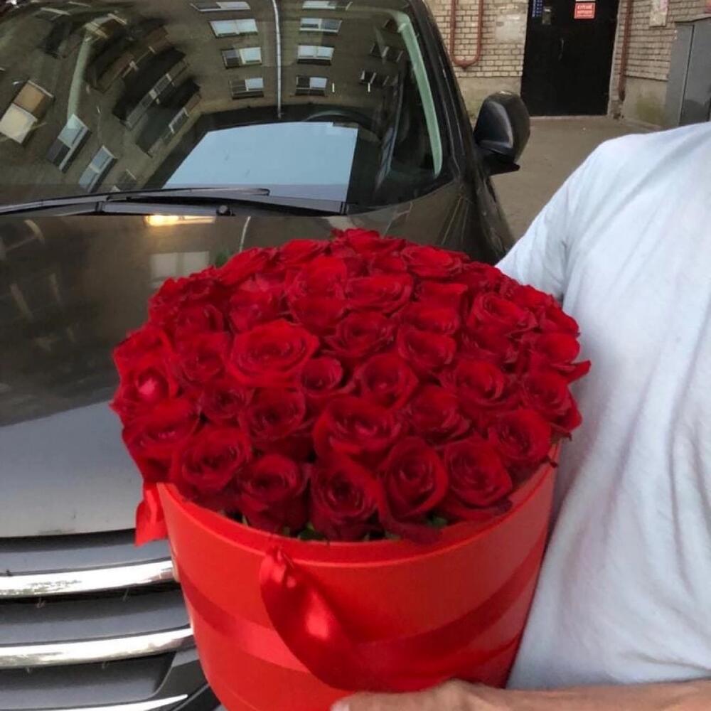 розы эквадор (60 см) – 51 шт.Шляпная коробка – 1 шт.Оазис флористический – 2 шт.Лента атласная – 1 шт.