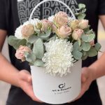 Хризантема – 3 шт. Кустовая роза – 2 шт. Эвкалипт – 2 шт.