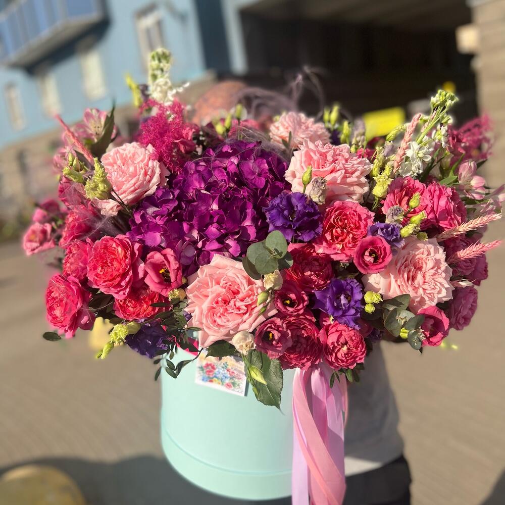 Коробка шляпная большая – 1 шт.Оазис флористический – 3 шт.Лента атласная – 7 шт.Гортензия – 1 шт.Эвкалипт – 3 шт.Фисташка – 7 шт.Роза пионовидная одноголовая – 7 шт.Роза кустовая пионовидная – 5 шт.Маттиола – 2 шт.Эустома – 7 шт.Альстромерия – 7 шт.Колосья – 20 шт.ковыль связка – 5 шт.Роза кустовая – 5 шт.мискантус – 2 шт.