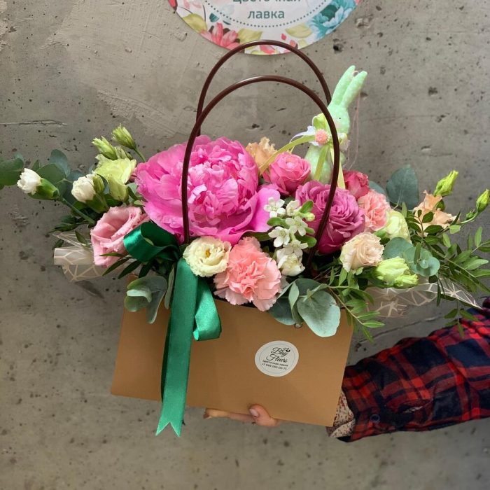 Крафт упаковка – 1 шт.Оазис флористический – 1 шт.Игрушка ручной работы – 1 шт.Пион – 1 шт.Роза – 1 шт.Гвоздика – 3 шт.Оксипеталум – 1 шт.Роза кустовая – 1 шт.зелень декоративная – 2 шт.Лента атласная – 1 шт.
