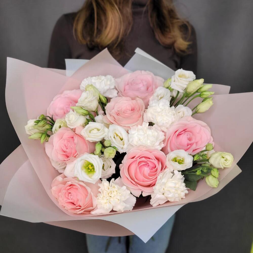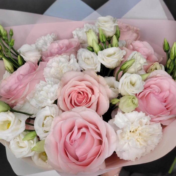 Лизиантус – 4 шт.Роза Эквадор – 7 шт.Лента атласная – 1 шт.Диантус – 5 шт.Упаковка дизайнерская – 5 шт.