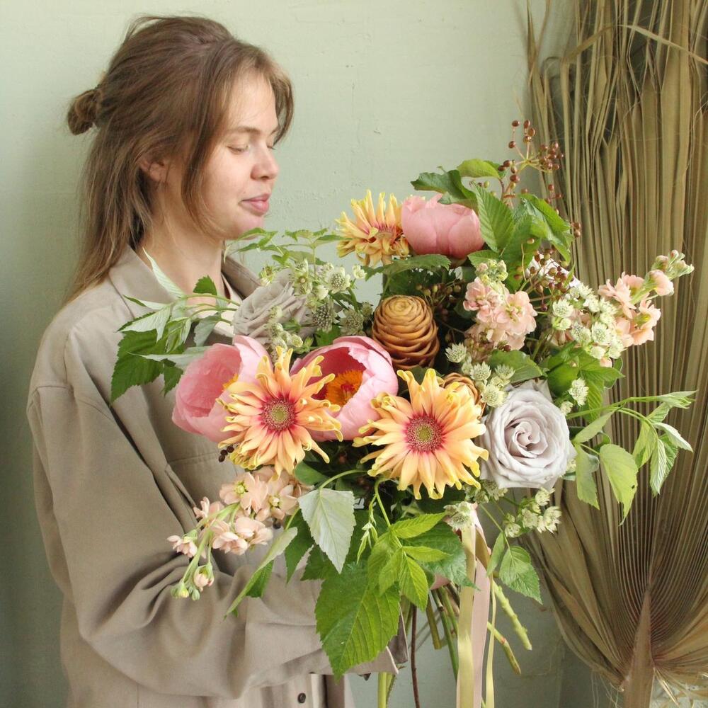 Имбирь – 2 шт.Пион – 3 шт.гербера кудрявая – 3 шт.Роза сортовая – 3 шт.Астранция – 3 шт.Маттиола – 3 шт.Вибурнум – 2 шт.Ветки малины – 5 шт.Лента атласная – 2 шт.