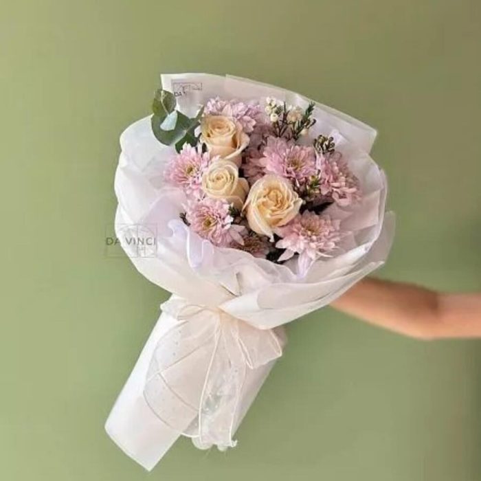 Роза голландская 60 см – 3 шт. Хризантема кустовая – 2 шт. Ваксфлауэр – 1 шт. Эвкалипт – 2 шт.