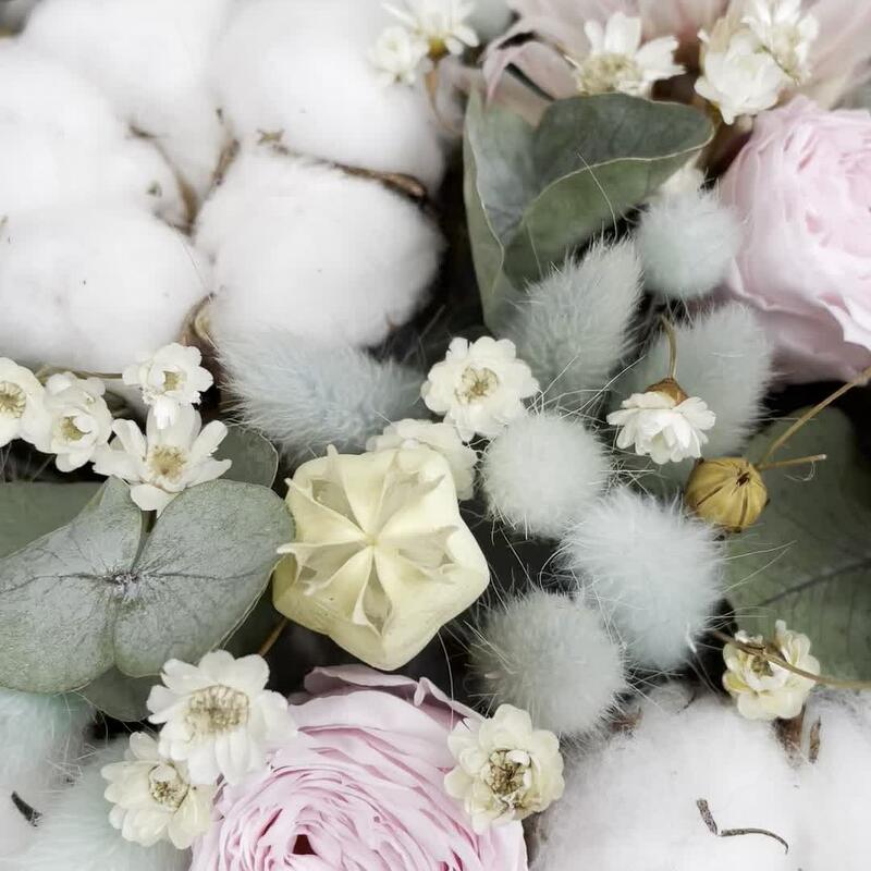 Стабилизированная роза – 6 шт.Хлопок натуральный – 7 шт.Эвкалипт сухоцвет – 10 шт.Лагурус (сухоцвет) – 20 шт.мак декоративный – 4 шт.лен сухоцвет – 3 шт.
