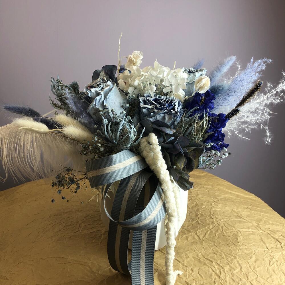 Кашпо керамическое – 1 шт.Упаковка дизайнерская – 1 шт.Оазис флористический – 1 шт.Роза стабилизированная – 3 шт.Перо – 1 шт.гипсофила сухоцвет – 2 шт.эрингиум сухоцвет – 1 шт.пампасная трава – 1 шт.гортензия сухоцвет – 2 шт.амарант стабилизированный – 1 шт.дельфиниум сухоцвет – 1 шт.Физалис – 1 шт.Лагурус (сухоцвет) – 8 шт.