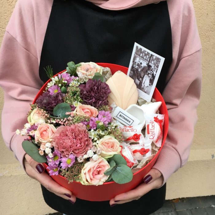 Хризантема Сантини – 1 шт. Кустовая роза – 2 шт. Диантус – 3 шт. Хамелациум – 1 шт. Седум – 3 шт. Открыточка с вашими пожеланиями – 1 шт. Свеча ручной работы – 1 шт. спички для свечей – 1 шт. Конфеты Raffaello – 5 шт. ракушка из гипса – 1 шт. Коробка подарочная – 1 шт.