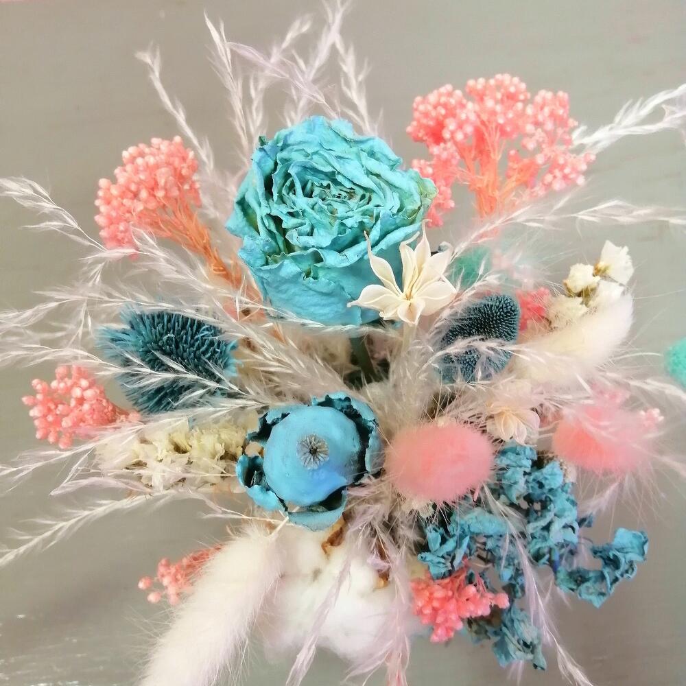 Роза сухоцвет – 1 шт.эхинацея сухоцвет – 2 шт.Озотамнус розовый – 1 шт.Хлопок натуральный – 1 шт.Лагурус (сухоцвет) – 6 шт.статица сухоцвет – 1 шт.Ковыль – 1 шт.кашпо ведерко – 1 шт.Оазис флористический – 1 шт.