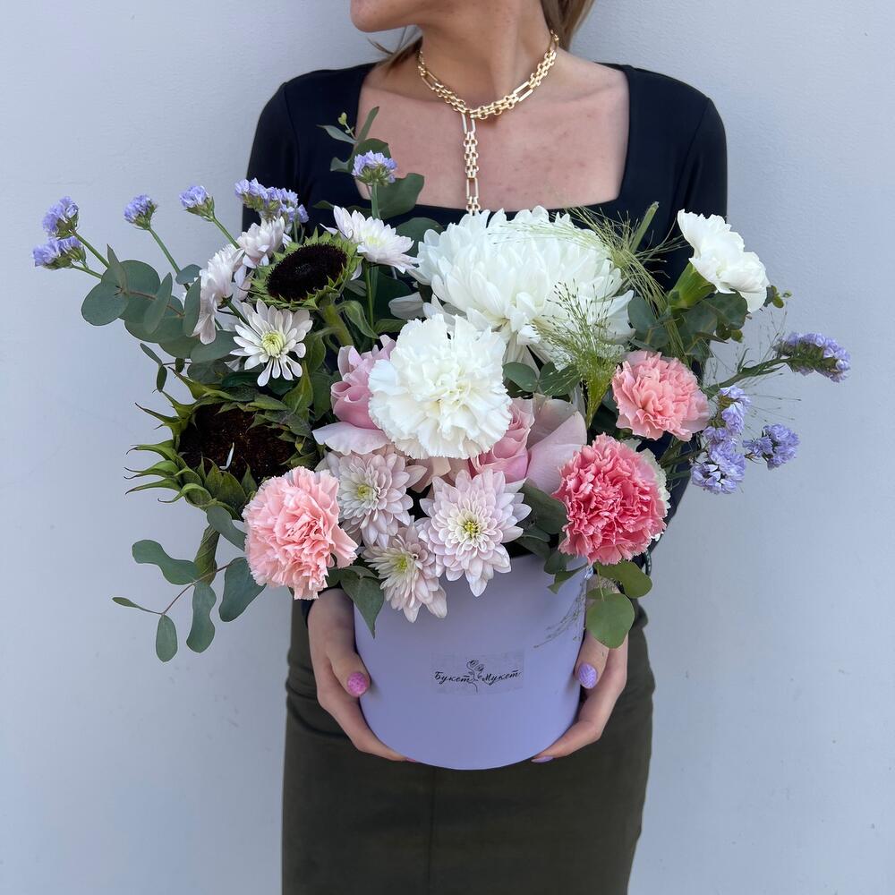 Хризантема Антонов – 1 шт.Диантус – 6 шт.Роза французская – 2 шт.Подсолнух – 2 шт.Паникум – 2 шт.Хризантема Балтика – 1 шт.Статица – 1 шт.Эвкалипт – 1 шт.Оазис флористический – 1 шт.Коробка шляпная – 1 шт.