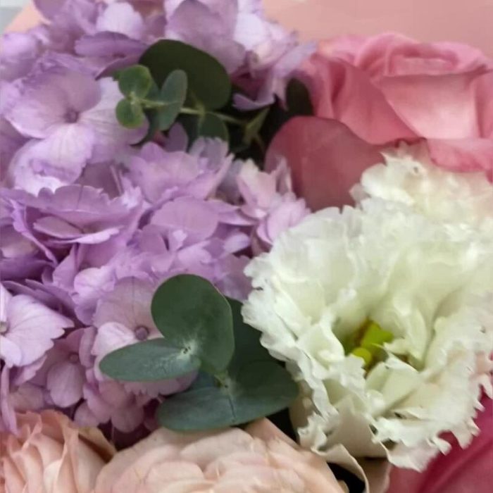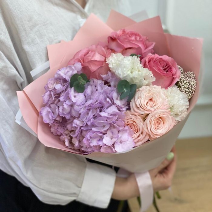 Гортензия – 1 шт.Озотамнус – 1 шт.Кустовая пионовидная роза – 1 шт.Пленка матовая – 2 шт.эустома белая – 1 шт.роза пинк экспрешн – 3 шт.эвкалипт 50 – 3 шт.