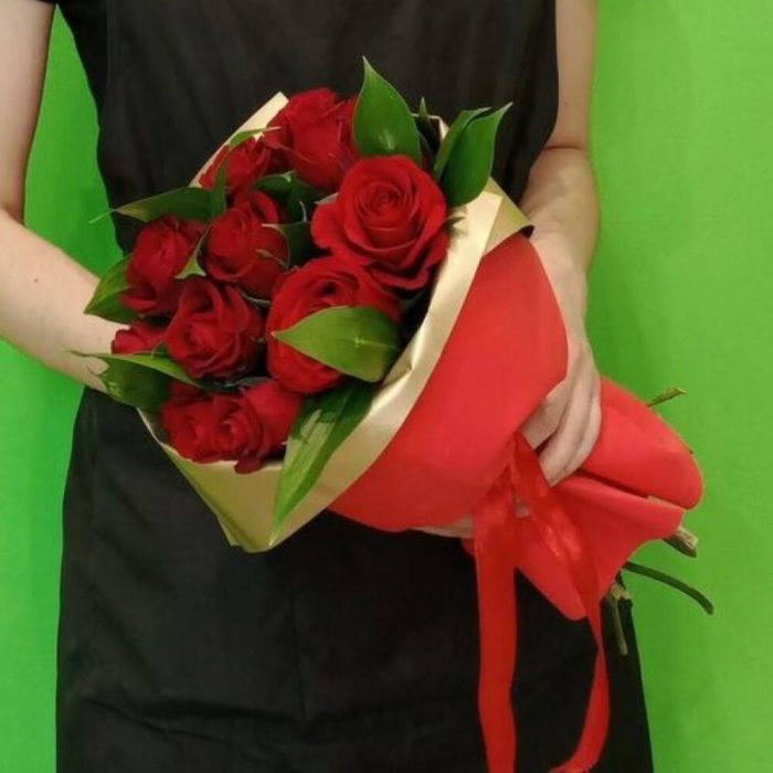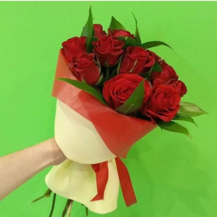 роза кения 50 см – 11 шт.Рускус – 7 шт.фоамиран лист – 1 шт.Лента атласная – 2 шт.